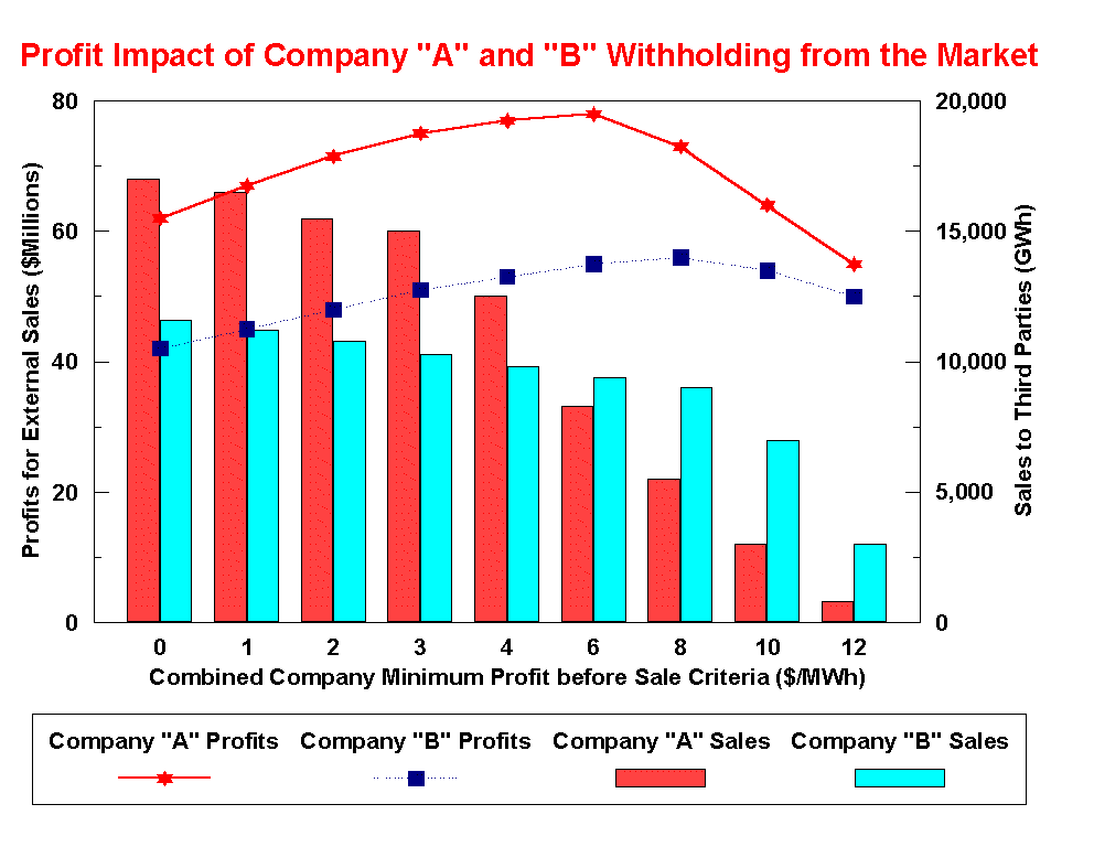 In the example shown in Figure 1, the minimum profit before sale criterion is varied from $0.00 to $12.00/MWh. At the $0.00/MWh minimum profit before sale criterion, Company A bids into the bulk power market at cost. It sells 17500 GWh and earns $62 million in profits on off system sales in the 36 time periods (twelve months for on-peak, mid-peak and off-peak). If Company A adopts a $1.00/MWh minimum profit before sale criterion, it loses some sales, but it is able to push prices up slightly, and its overall profit will increase to $63 million. At a $2.00/MWh minimum profit before sale criterion, it loses more sales, but it is able to push prices up slightly, and its overall profits increase further to $64 million. The trend continues with a $3.00/MWh minimum profit before sale criterion. At a $4.00/MWh minimum profit before sale criterion, it loses sales faster than its profit margins per MWh increases, and its overall profits decrease. At a $12.00/MWh minimum profit before sale criterion, it sells very little, and makes correspondingly little in the bulk power market.