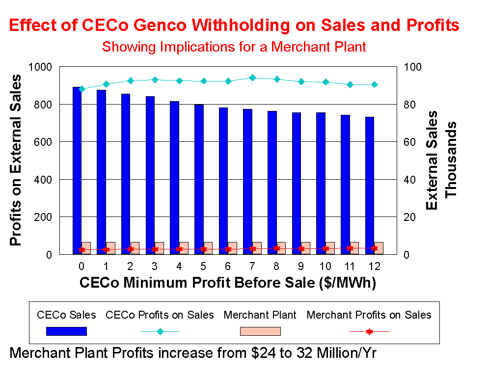It should be noted that for this analysis, all other companies were assigned a $1.00 minimum profit before sale criterion. To maximize profits, the CECo GENCo would implement the strategy of withholding until it meets the $7.00 minimum profit before sale criterion. These results show that it would not be risking much by implementing this criterion -- unless management is rewarded by the Board of Directors for maximizing GWh sales. The CECo GENCo should pursue the higher minimum profit before sale criterion, hoping that other large GENCos -- such as Ameren, AEP and others, would follow and increase their minimum profit before sale criterion. If other large suppliers followed the CECo lead, profits for CECo would increase beyond those shown here.
