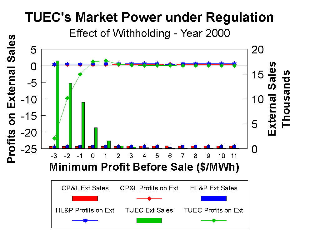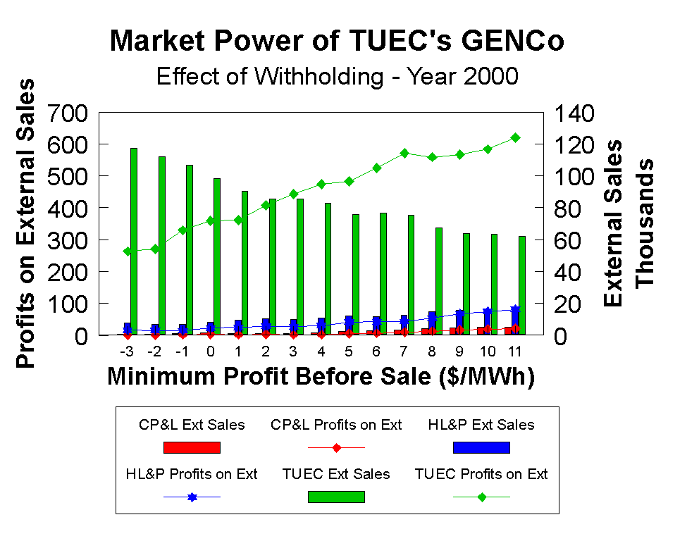 In Figure 5, TUEC is tested at minimum profit before sale criteria as high as $11.00/MWh and as low as $ -3.00/MWh (e.g. willing to lose no more than $3.00/MWh) in a search of greater market share. This does not mean that they receive the bid price when they make a sale -- they get the prevailing market clearing price for all of their sales. However, this criterion indicates their willingness to make energy available for off-system sales. The results show that even a company with 40 percent of the constrained market can maximize profits at only $1.5 million with $0.00- 1.00/MWh minimum profit before sale criteria. Not much market power for such a large market participant!