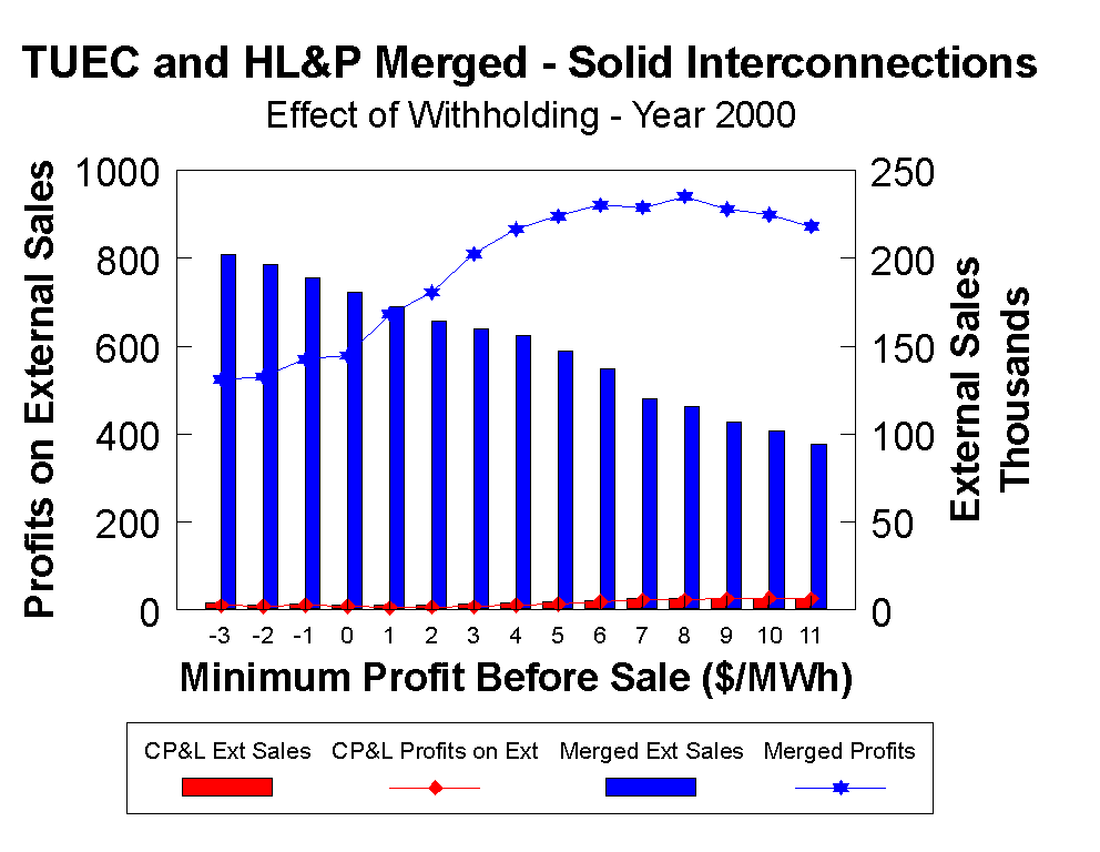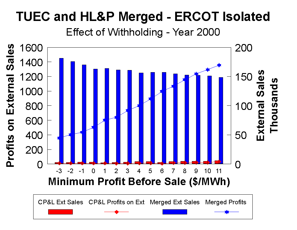 Another interesting example is to analyze the effect of market power on a merged TUEC and HL&P GENCo. This new market entity would comprise 65 percent of the ERCOT market and clearly would be able to exert market power and push prices up. This ability is illustrated in Figure 7, where regardless of how high the minimum profit before sale criteria is pushed, sales do not drop off significantly.